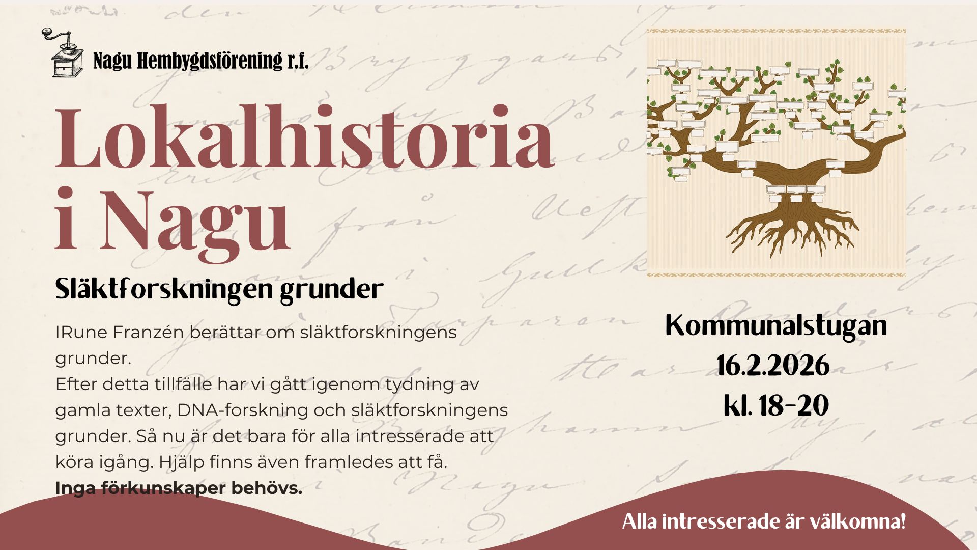 Efter detta tillfälle har vi gått igenom tydning av gamla texter, DNA-forskning och släktforskningens grunder. Så nu är det bara för alla intresserade att köra igång. Hjälp finns även framledes att få.